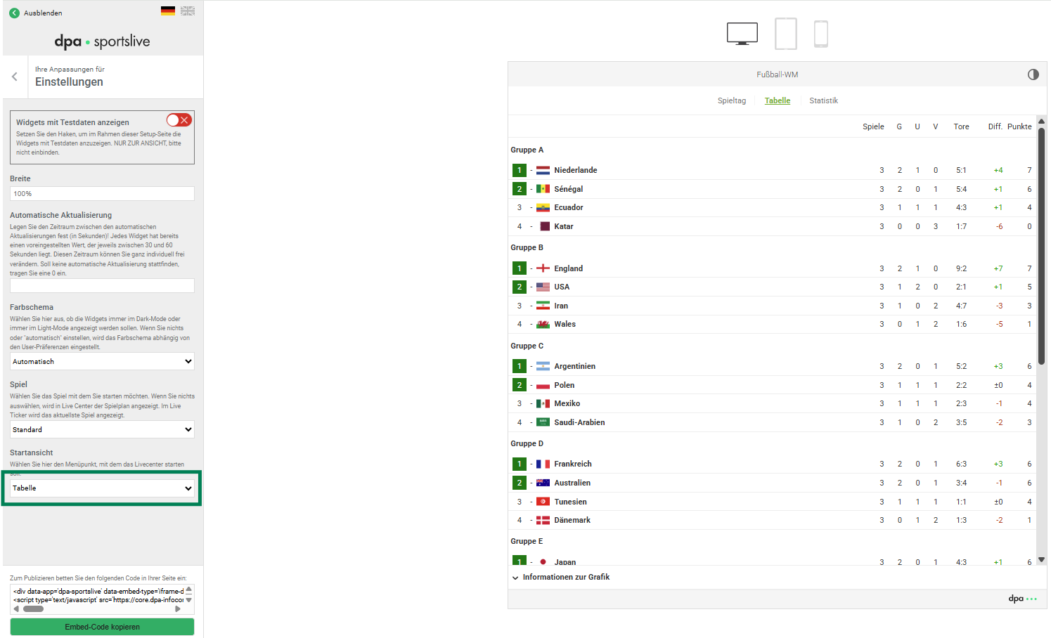 There you can make various settings and then generate your own embed code. You then integrate this code into an article or page in your CMS and publish it. The graphic widget will then be displayed on your website.