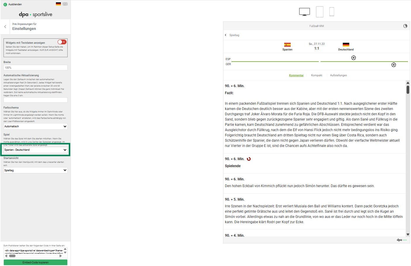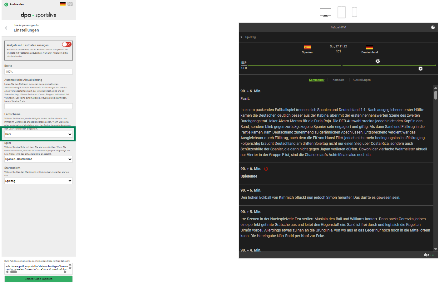 In the dpa Shop, SportsLive always shows all available widgets in the preview with test data or data from the last season or the last event. With ElectionsLive, you have the option of displaying test data by checking the box “Show widgets with test data” on the setup page under “Settings.” Feel free to contact us if you need additional data for testing.