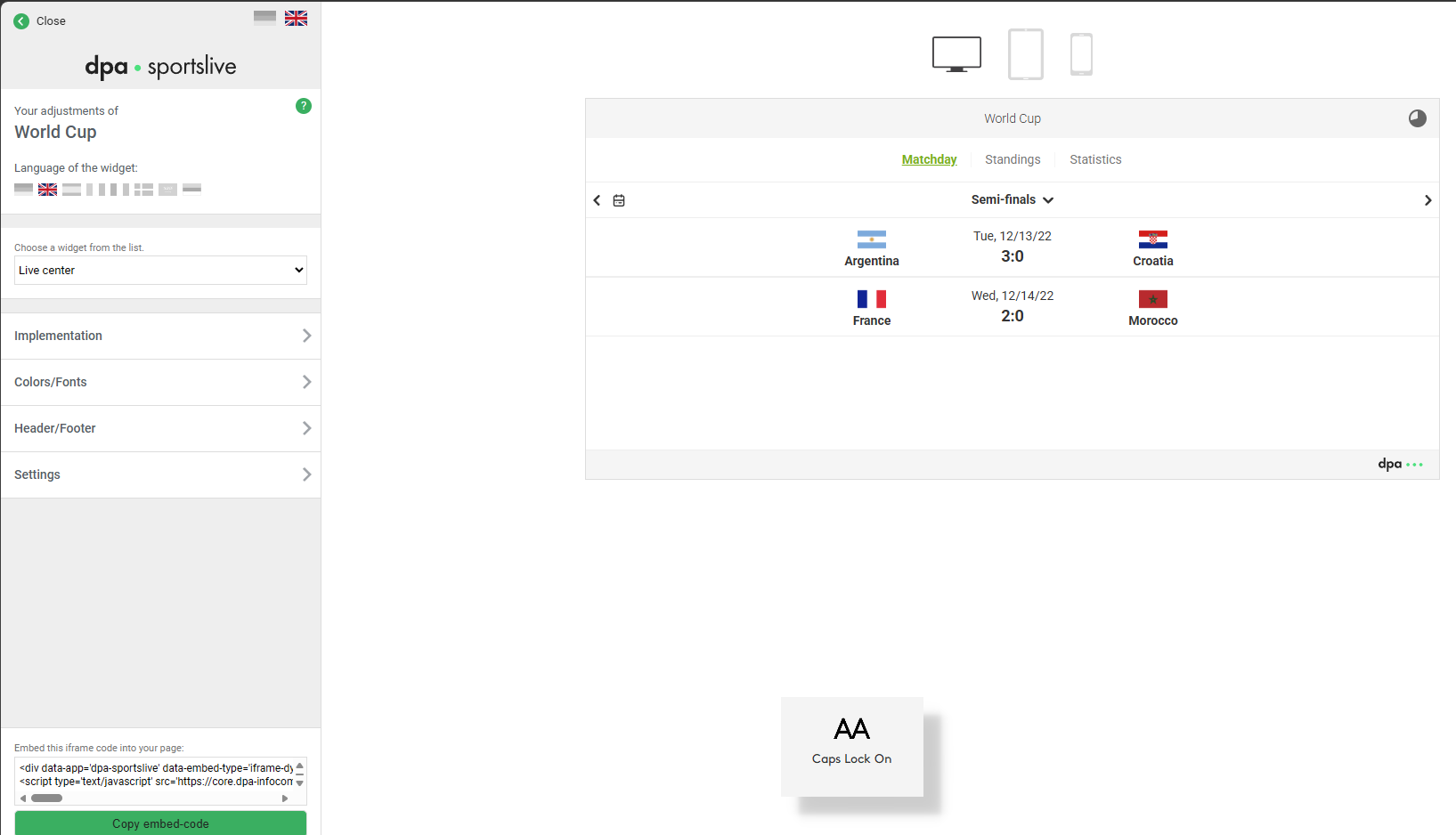 dpa-SportsLive has a modular structure: Whether tables, results, or live tickers, there is a dedicated widget for all different result types and content. All widgets can be quickly embedded as graphical elements in web articles or used as a landing page for the event. They are ideally suited as teaser elements on the homepage, linking from there to special sports pages.