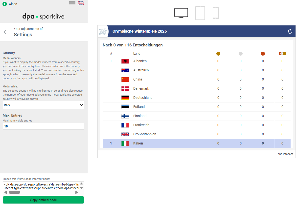 - After selecting a country, the chosen country will be highlighted in color in the widget. If you also reduce the number of countries displayed in the medal table, the selected country will always be shown, even if its ranking is outside the maximum number of entries.