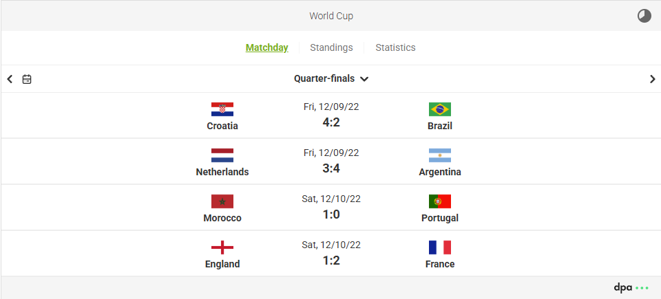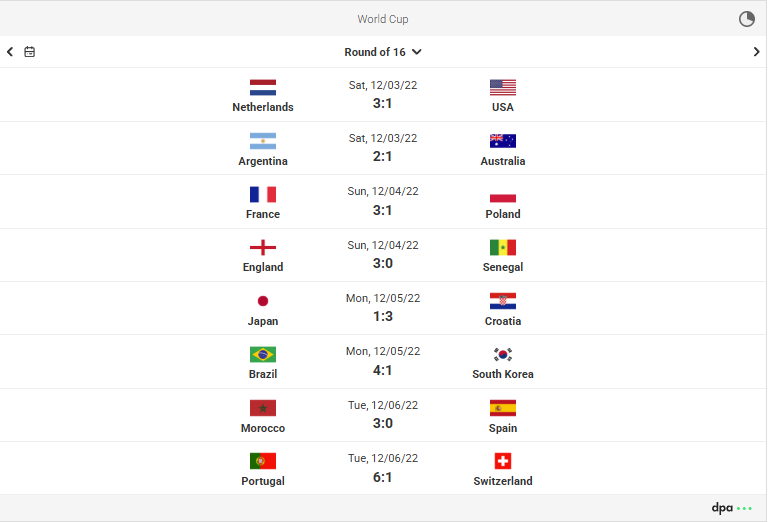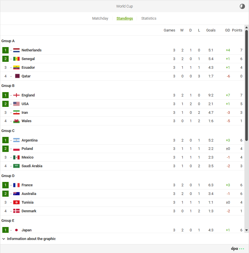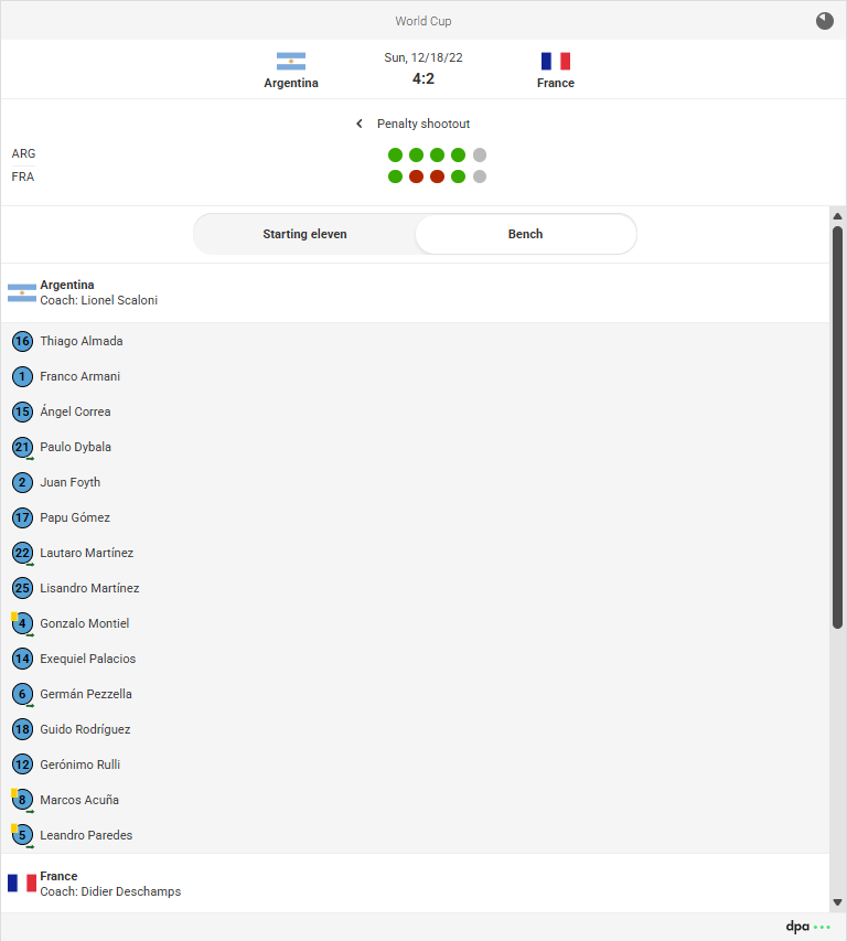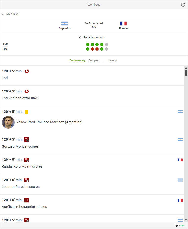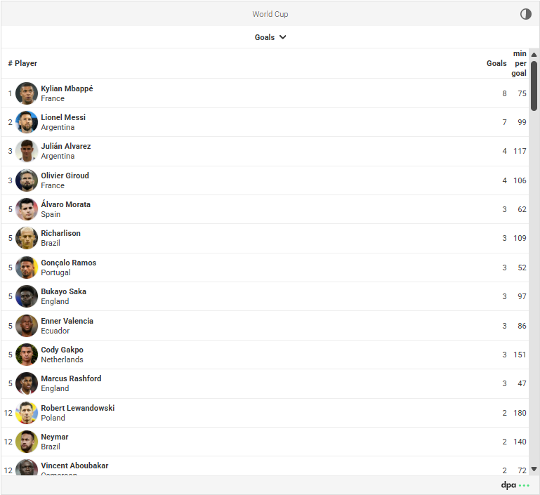 The dpa-SportsLive Football widgets underwent extensive refactoring for the 2026 FIFA World Cup. Among other things, the requirements of the German Accessibility Strengthening Act (BFSG) were implemented. Our latest widget generation is accessible, optimized for mobile use, and supports dark mode. A flat widget version can also be used as a teaser to save space on websites.