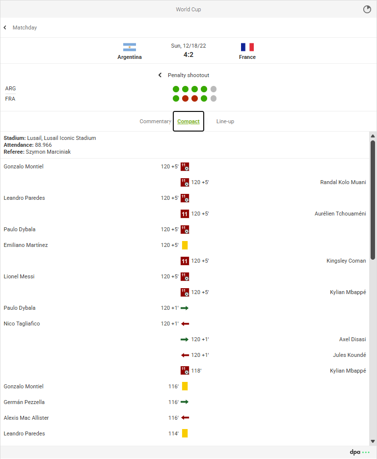 - The compact view includes goals, penalty goals, missed penalties, substitutions, yellow cards, and red cards.
