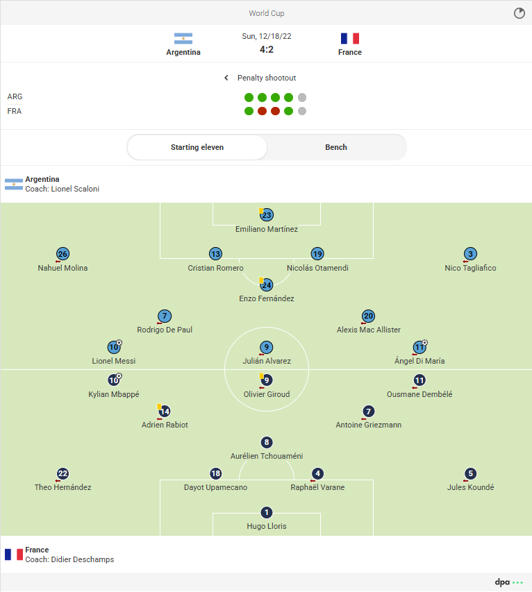 - In addition to player names, the cards, goals, and substitutions for each player are shown.